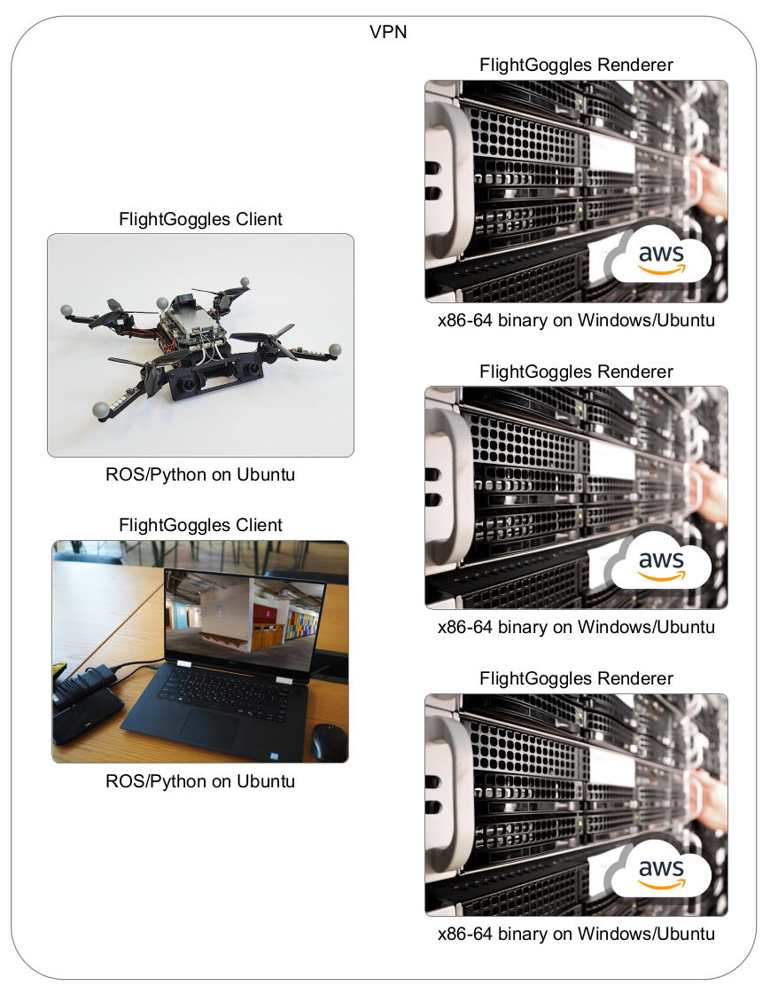 The Renderer and Client can run on separate computers connected to a local network or a virtual private network (VPN). For example, for hardware-in-the-loop experiments the Renderer can be run on a desktop computer, while the Client runs on a mobile computing platform. The Renderer can also run in the cloud, which we have verified using Amazon Web Services (AWS).