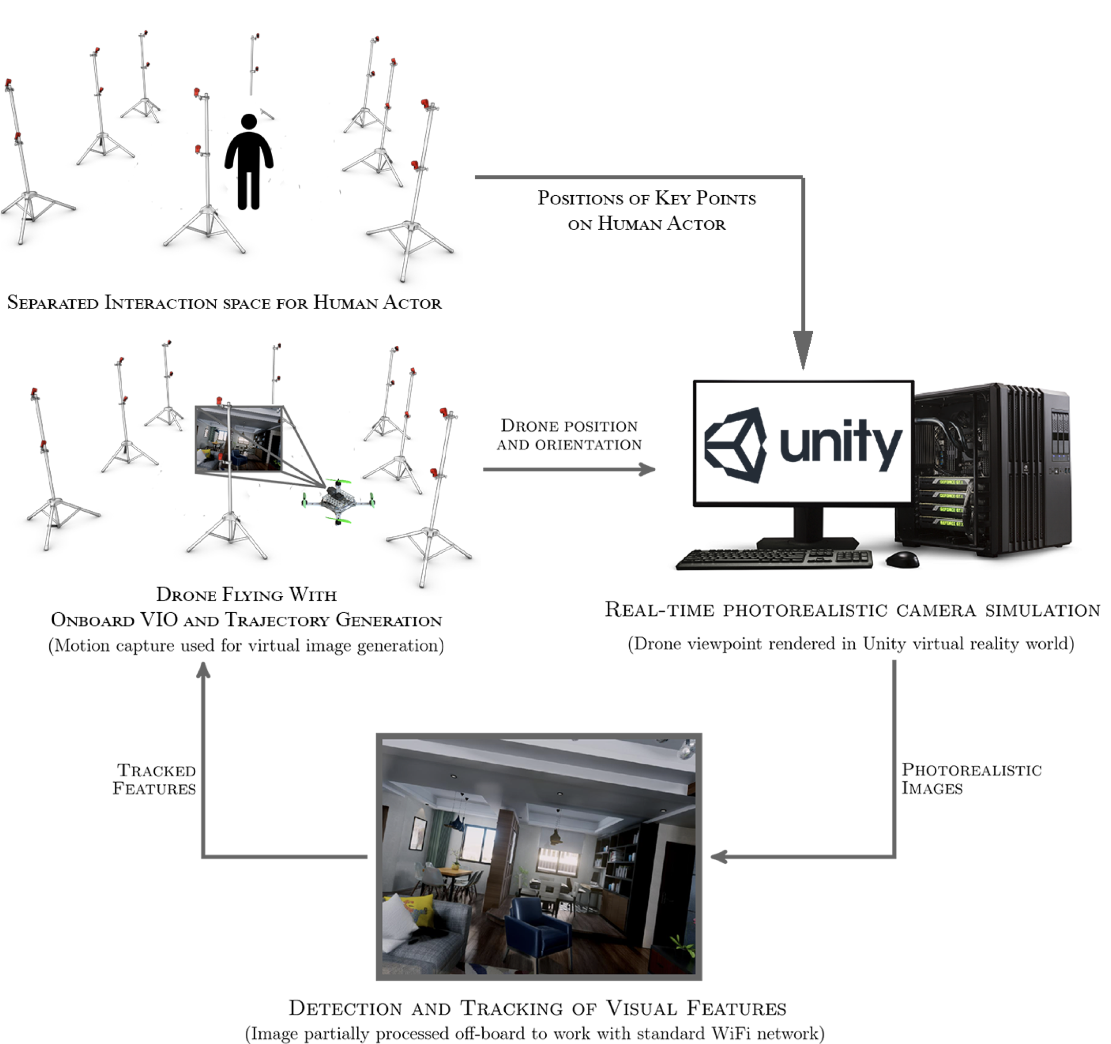Fig 1. Dataflow for using Virtual Reality Simulation with motion capture for visual inertial navigation.